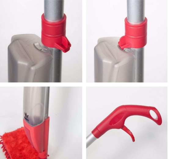 در ابتدایی ترین قسمت دسته این تی زمین شوی که در دستان شما قرار میگیرد، ماشه ای فشاری تعبیه شده است که شما با فشردن آن میتوانید مواد شوینده درون مخزن را به بیرون هدایت کنید. با کشیدن به سمت بالای این اهرم مقداری از مواد شوینده به جلوی سری طی اسپری میشود. این امر سبب می شود تا شما بتوانید به راحتی با استفاده از یک محصول تمامی سطوح مورد نظر را با صرف کمترین وقت و انرژی از آلودگی های پاک سازی کنید.
